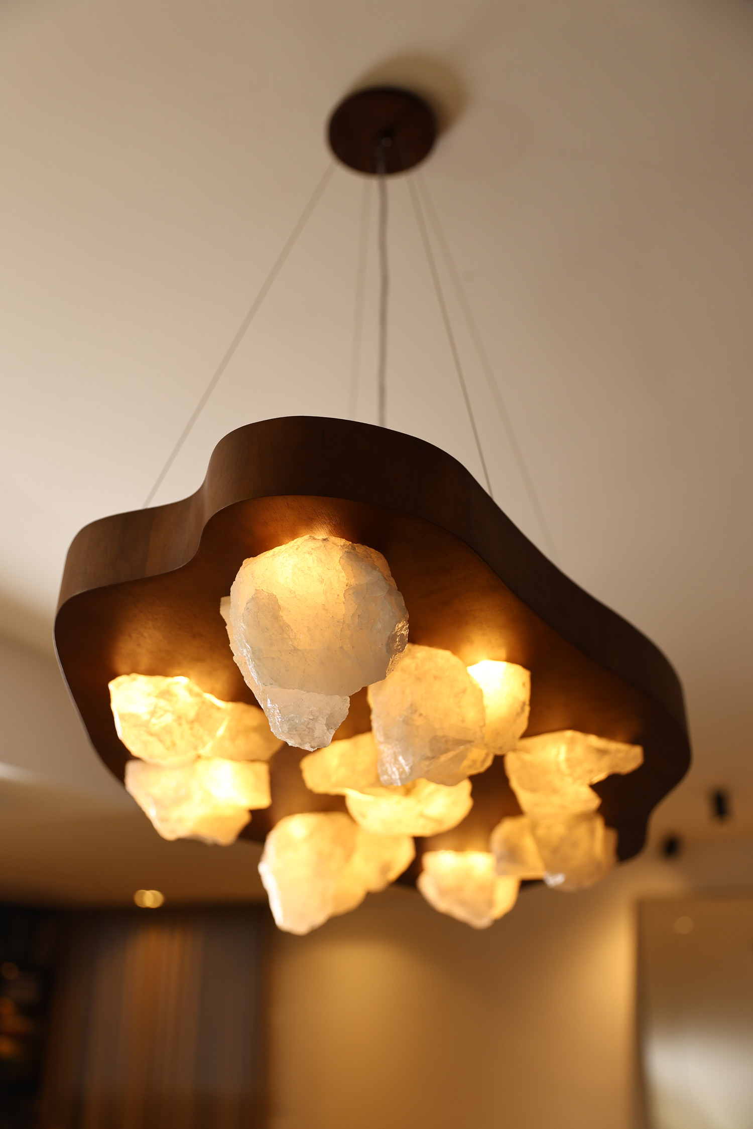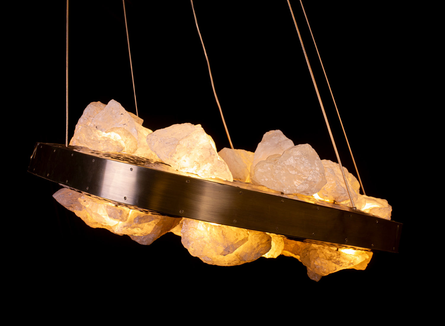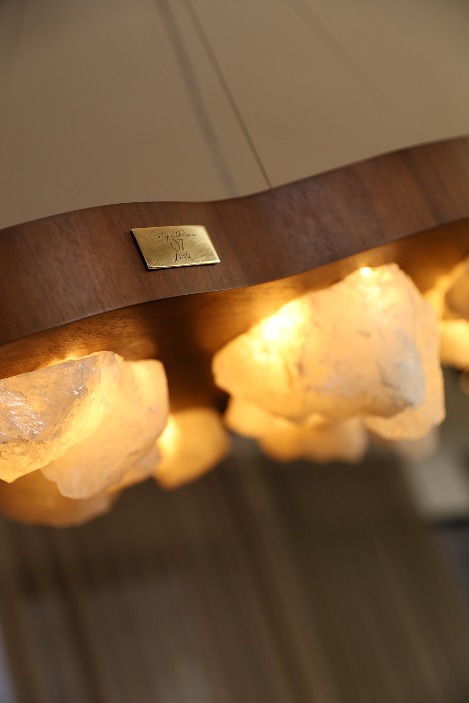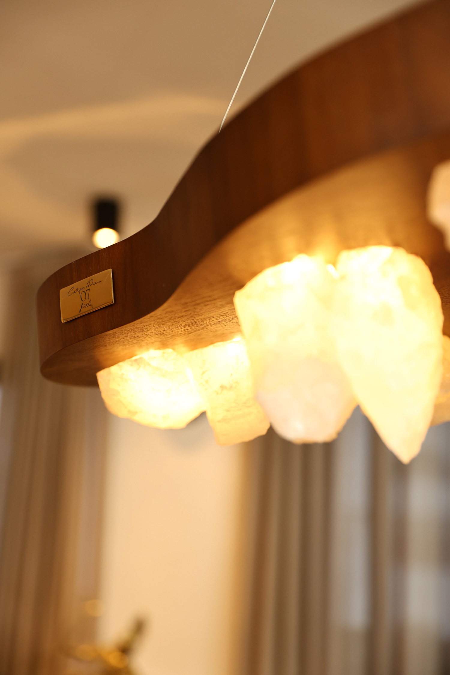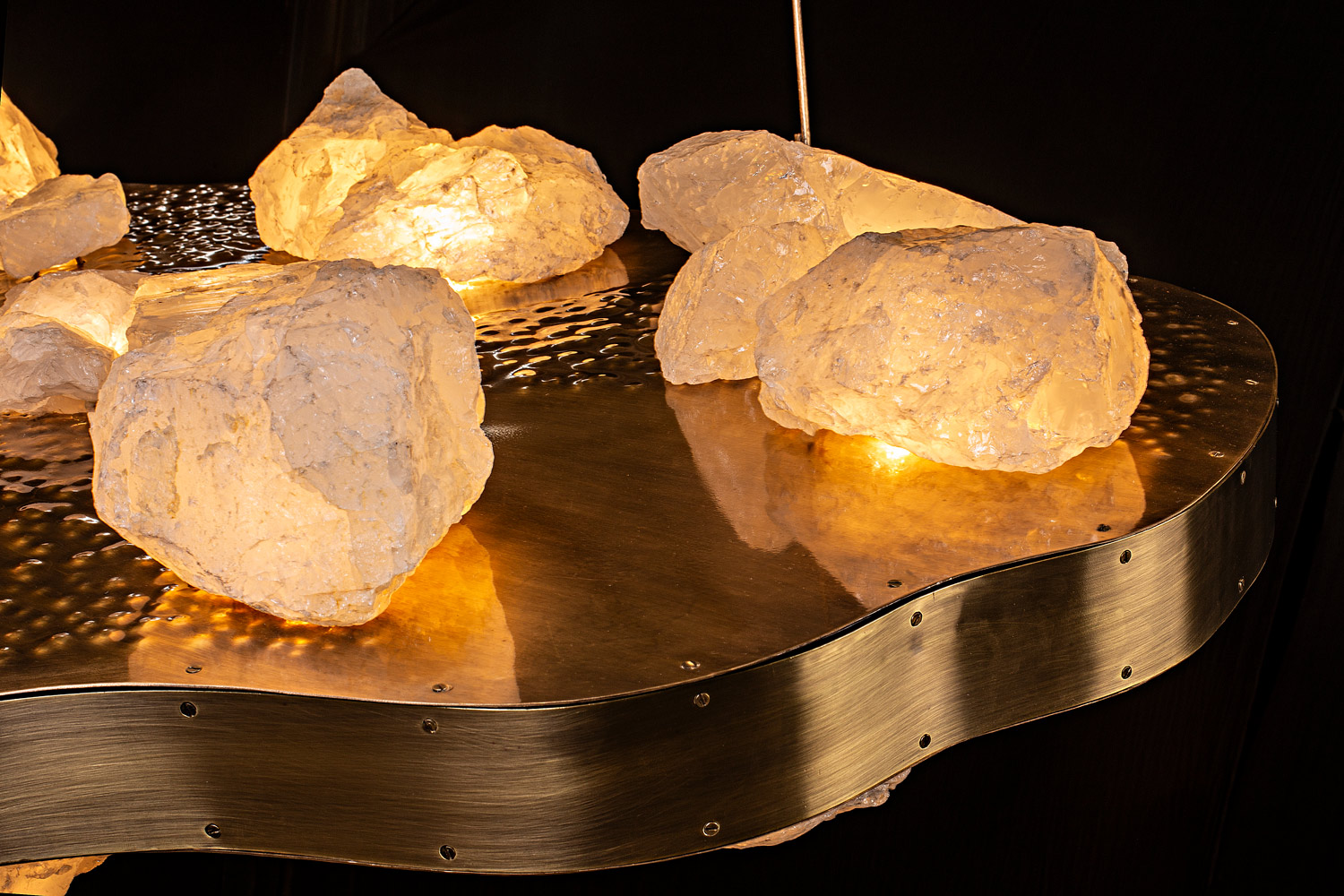 C’est ainsi que j’ai développé ce lustre avec une base en laiton semi-martelé et lisse, en forme de cristal de roche pour lui donner une dimension 3D et le soulagement du cristal de roche pur. De chaque côté, j’ai ajouté des cristaux aléatoires pour diffuser cette énergie dans les âmes des personnes qui y pénétreront. Je cherchais à créer une expérience qui agit sur le corps, aidant à dynamiser les individus et l’environnement pour promouvoir le bien-être et soigner les problèmes liés aux champs émotionnels, physiques, mentaux et énergétiques. Cette œuvre magistrale a une histoire captivante qui a commencé avec sa propre création.